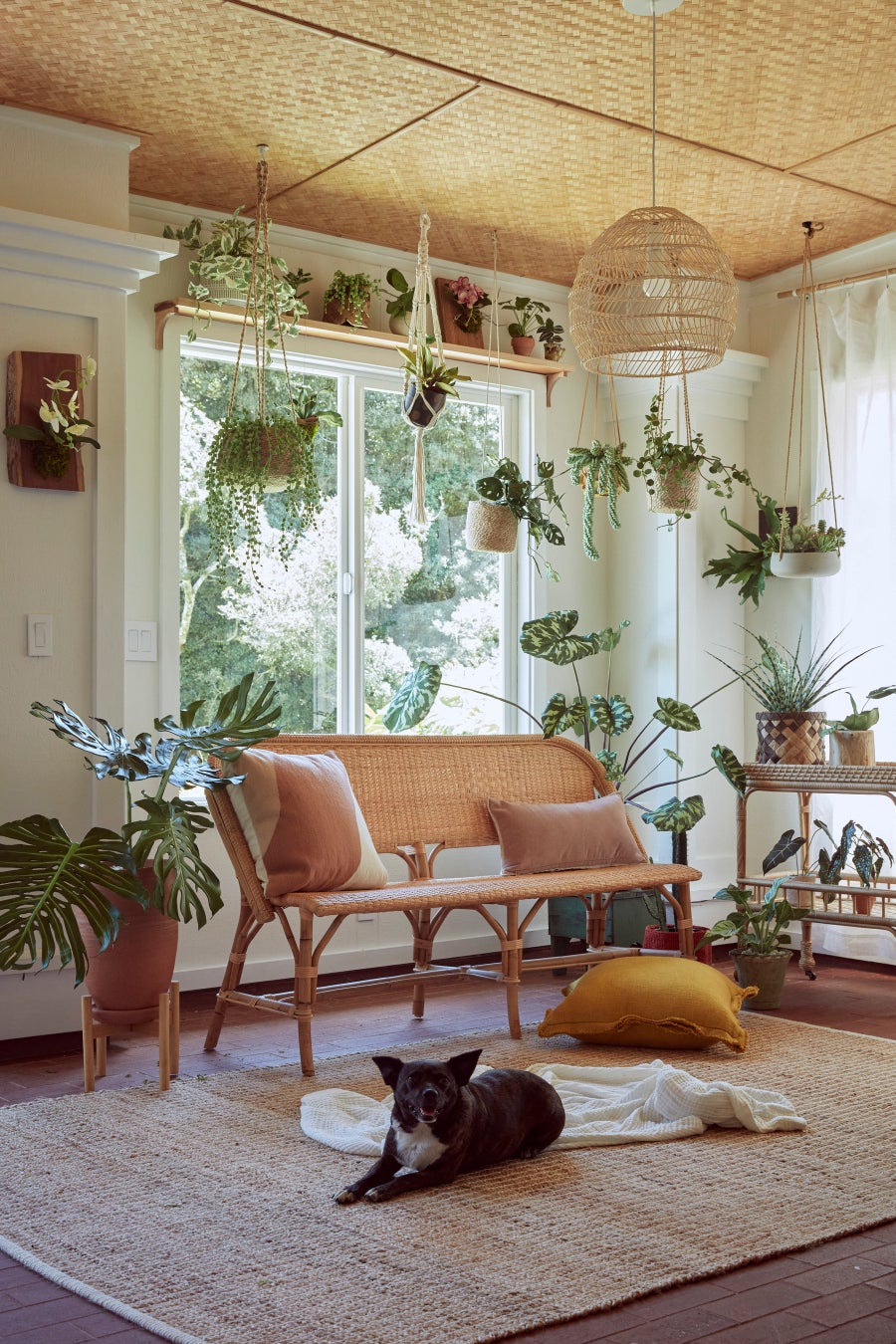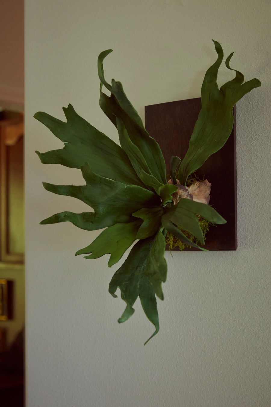 緑に囲まれたリビングは癒しの空間。ポットの観葉植物や壁掛けグリーンなど、クレイで作った植物で空間をスタイリングしています。クレイなら枯れたり、形が崩れたりすることがないので、常にベストな状態で部屋を彩ってくれます。