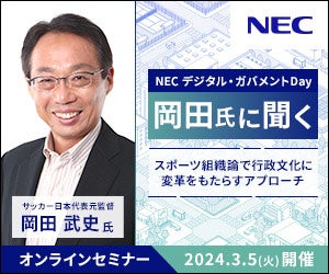 NECは、行政分野における業務改革の事例を通じて、業務効率化や働きがいを得やすい環境づくりについて考えるオンラインセミナーを開催します。サッカーから地方創生に取り組む岡田武史氏による基調講演をはじめ、行政機関における生成AIの活用事例紹介や、静岡市における業務効率化に向けた具体的な事例など、行政職員が改めて働き方を考えるための貴重な情報をお届けします。