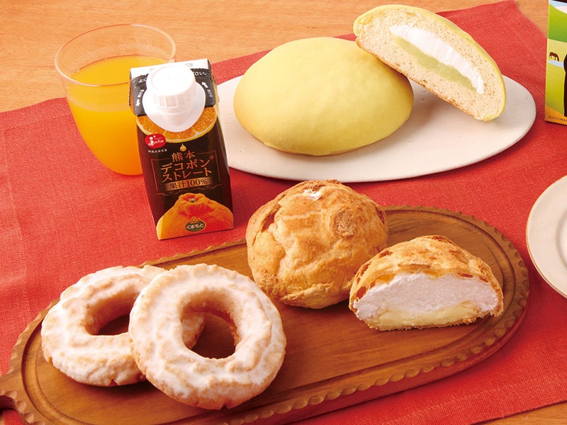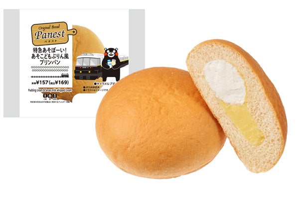 「あそぼーい!」で提供される「こどもぷりん」をイメージ。ふんわりとしたブリオッシュ生地に、カラメル風味のなめらかなプリン風クリームを包んで焼き上げ、阿蘇小国ジャージー牛乳のホイップクリームを入れました。
