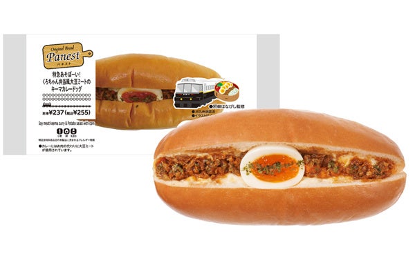 「あそぼーい!」で提供される「くろちゃん弁当」をイメージ。ドッグロールに、大豆ミートのキーマカレー、コーン入りポテトサラダをはさみ、スライスたまごをトッピングしました。