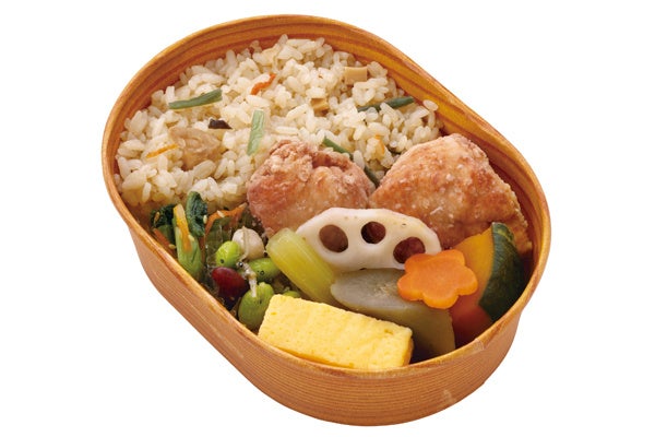 「ゆふいんの森弁当」の春献立をイメージした、たけのこ山菜ごはんと鶏唐揚げが楽しめるミニ弁当です。