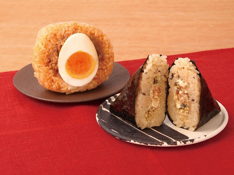 博多一風堂監修の「極からか麺」風のおにぎりです。豚骨だしご飯に辛みのある肉そぼろを合わせ、塩味のゆでたまごをトッピングしました。辛みの中に豚骨だしの旨みが感じられる、コク深い味わいです。