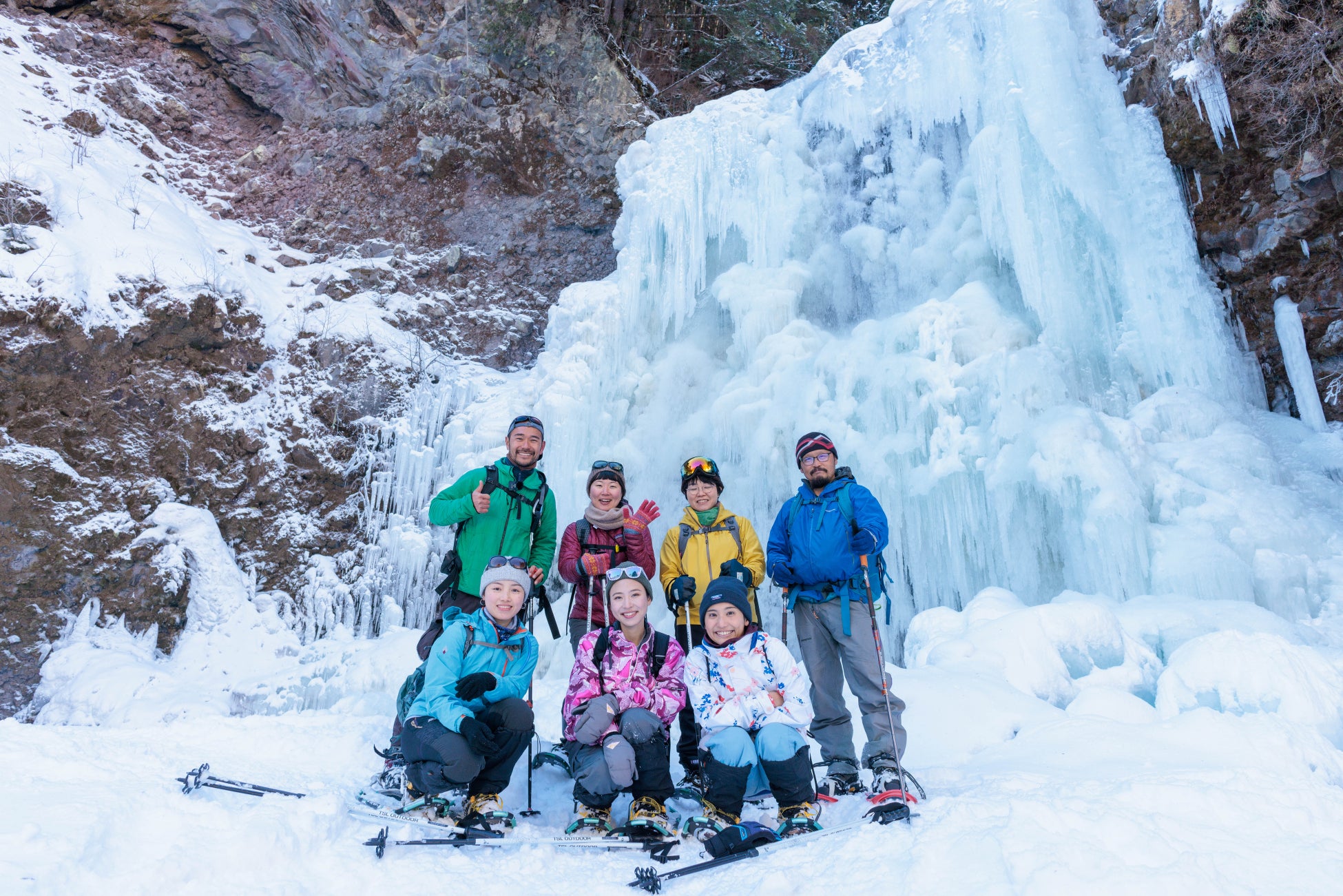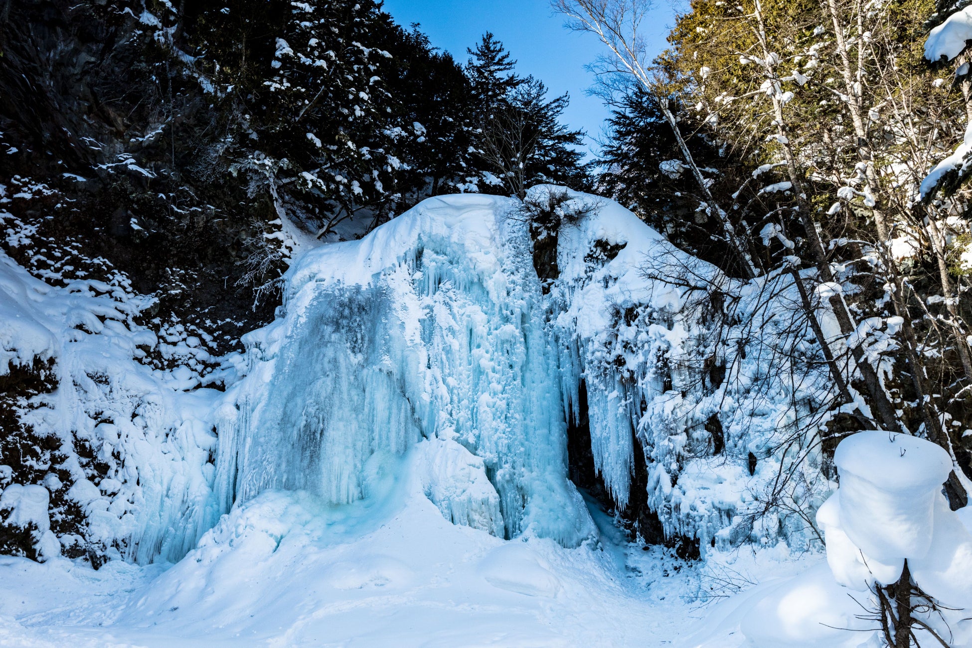 滝が凍り付く「氷瀑」を目指すスノーシュートレッキングです。標高差はなんと20m。薄い青色の氷柱がとても幻想的で、厳冬のこの時期にしか見ることができない絶景です。