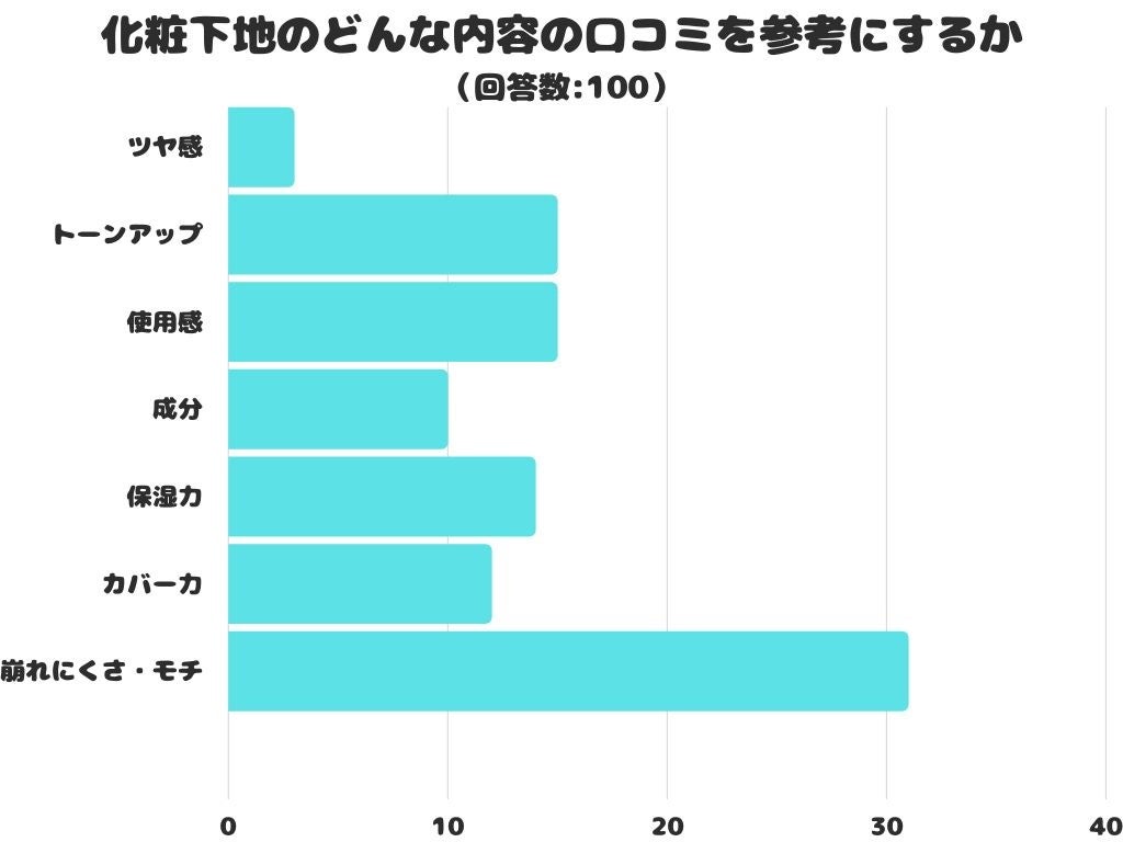 化粧下地のどんな内容の口コミを参考にするかをアンケートにて調査したところ、1位は「崩れにくさ・モチ」でした。