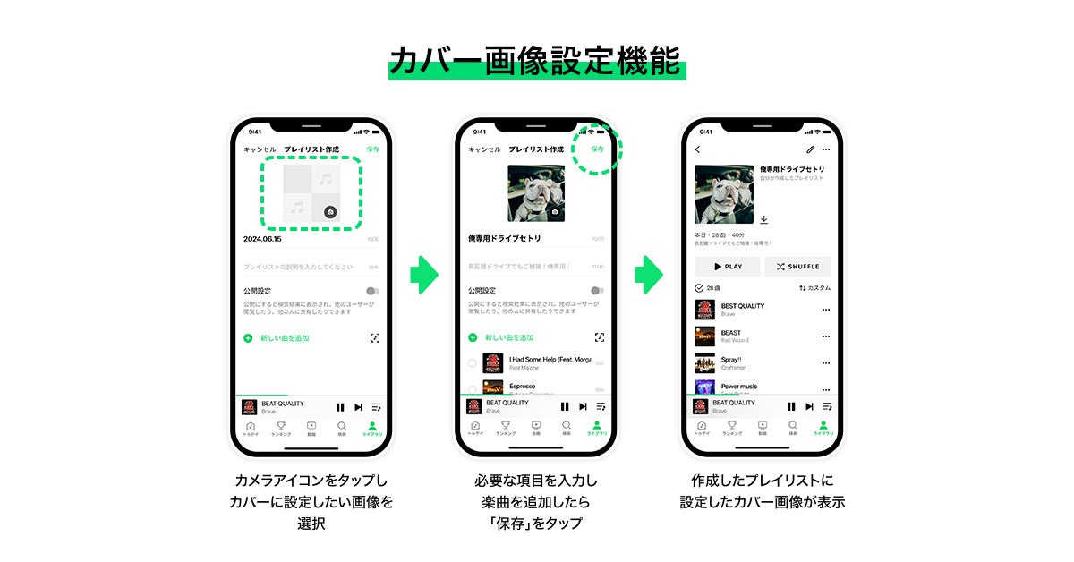 今回のアップデートでは、すべての再生リストに「オートプレイ機能」を拡張したほか、プレイリストに「カバー画像設定機能」を新たに追加しました。「オートプレイ機能」では、レコメンド曲で新たな楽曲やアーティストとの出会いを創出し、「カバー画像設定機能」では、カスタマイズの楽しさとより豊かな再生体験を提供します。