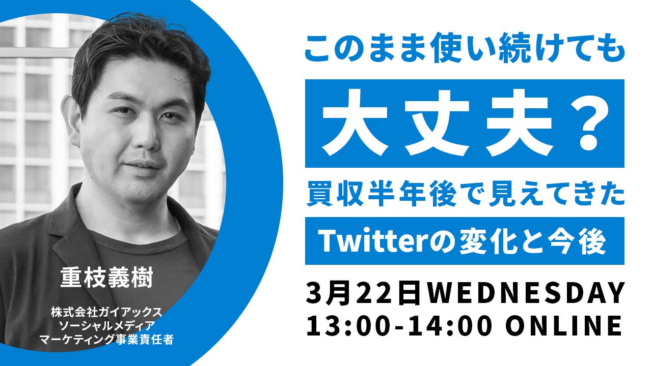 SNSをハブにしたマーケティング支援事業を展開する株式会社ガイアックス(本社:東京都千代田区、代表執行役社長:上田 祐司、証券コード:3775、以下 ガイアックス)は、2023年3月22日(水)13時より、無料オンラインセミナー「【このまま使い続けても大丈夫?】買収半年後で見えてきたTwitterの変化と今後」を開催いたします。