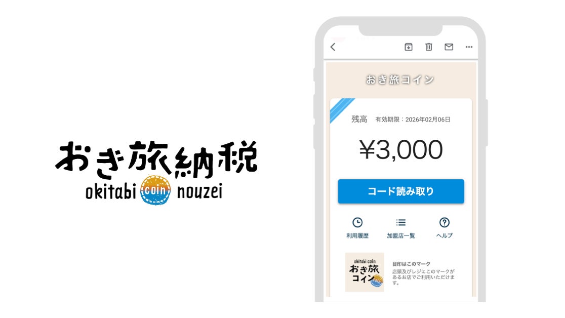 「おき旅コイン」は、2025年4月22日(火)より、4町村の飲食店・体験施設・宿泊施設をはじめとした加盟店37店舗(2025年4月22日(火)時点)での精算時に利用可能であり、おでかけや旅行を楽しみながら地域経済に還元することができる、「旅先納税®」の返礼品です。10,000円から100,000円までの寄附額に応じて、3,000円から30,000円まで全5券種の「おき旅コイン」が返礼品として贈られます。受け取り・利用の際にアプリなどをダウンロードする必要なく、会計時は1円単位で利用いただけます。加盟店での利用も大変簡単で、店舗でのお会計時に、お手持ちのスマートフォンで「おき旅コイン」の二次元コード読み取り画面から、店舗に設置された二次元コードを読み取った後、利用金額を入力・確定し、加盟店に支払い完了画面を提示することで支払いが完了します。支払い完了時に「消し込み」という処理が行われ、そのタイミングで利用済みのチケットとして認識されるため、再利用等の不正利用を防ぐことができます。