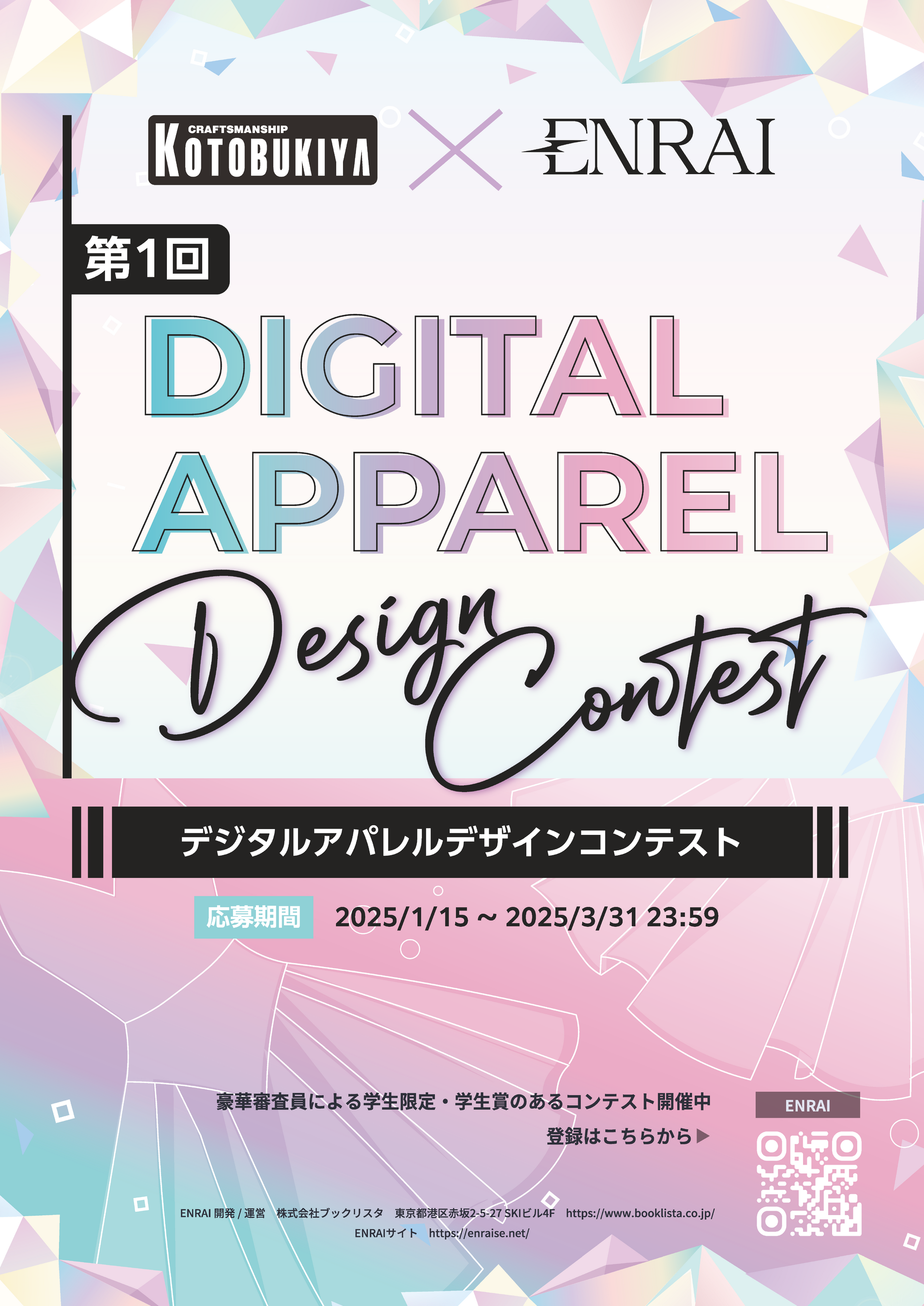 〈デジタルクリエイター〉と〈クライアント〉をつなぐポートフォリオEC「ENRAI(https://enraise.net/)」を運営する株式会社ブックリスタ(本社:東京都港区、代表取締役社長:村田 茂、以下「ブックリスタ」)と、フィギュア・プラモデル・ホビーのメーカーであり常に感動と驚きを提供するために開拓精神を以って挑戦し続ける株式会社壽屋(本社:東京都立川市、代表取締役社長:清水 一行)らは、広がっていくバーチャルファッションの世界に合わせ、現実のアパレルのリアリティをVRアバターの世界へと移植することを目指す「第1回デジタルアパレルデザインコンテスト」のエントリーの受付を開始いたしました。