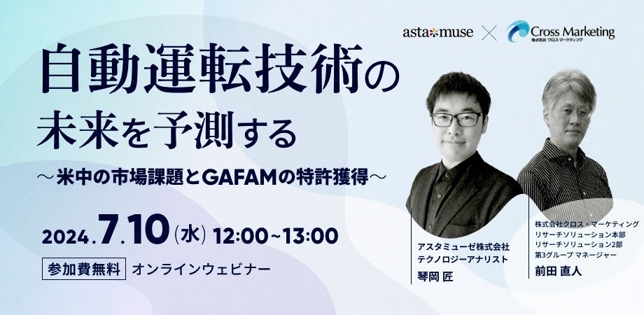 【クロス・マーケティングxアスタミューゼ共催セミナー】自動運転技術の未来を予測する ~米中の市場課題とGAFAMの特許獲得~