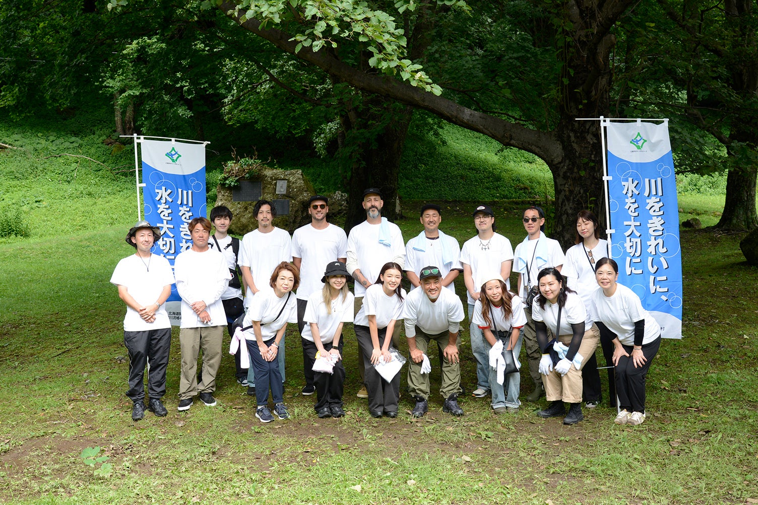 当社SDGs推進室が制作し、上川町に提供した「石狩川クリーンアップ作戦」仕様のTSIホールディングスと上川町のネーム入りTシャツを全員が着用。