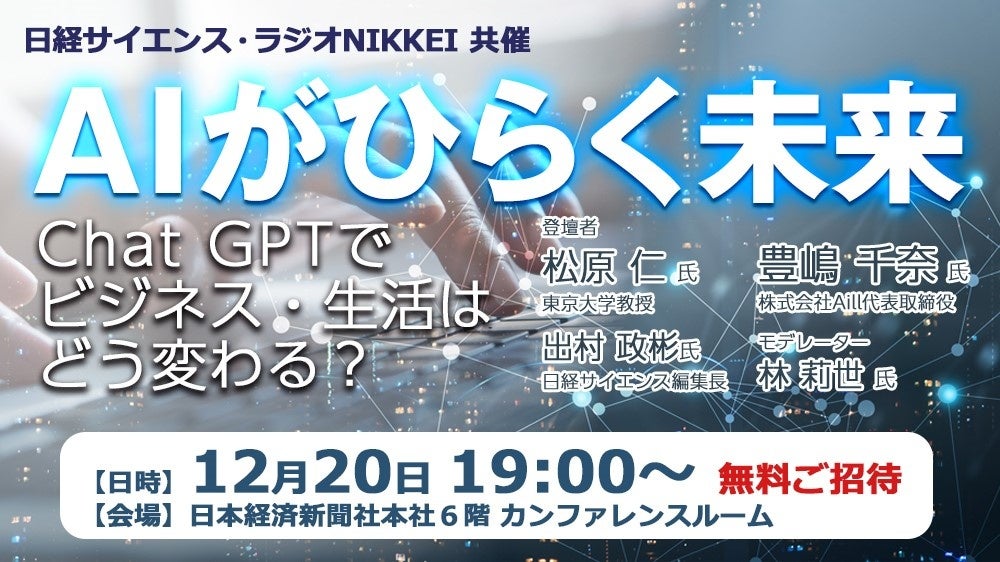 日本経済新聞社のグループ会社、日経サイエンスはラジオNIKKEIと共同で、公開収録イベント「AIがひらく未来 ~Chat GPTでビジネス・生活はどう変わる?」を12月20日(水)に開催します。