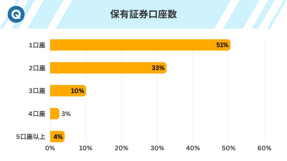 現在保有している証券口座数は、「1口座」が49.5%と約半数を占める一方、「2口座」(32.6%)、「3口座」(10.1%)と複数口座を保有する人も半数近くにのぼります。しかし、実際に「取引に利用している」口座数を見ると、「1口座」が68.1%と大幅に増加し、「2口座」は24.4%に減少します。このことから、多くの投資家が情報収集や用途に応じて複数の口座を開設しつつも、主要な取引は特定の口座に集約している実態がうかがえます。