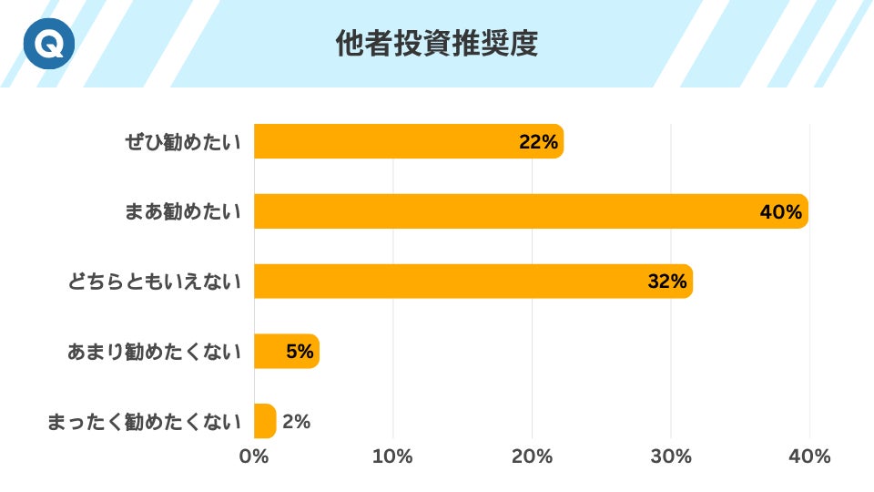 友人や同僚が株式投資を検討している場合、どの程度おすすめしたいかという質問では、「ぜひ勧めたい」(22.3%)と「まあ勧めたい」(39.9%)を合わせると62.2%が肯定的な意見を示しました。「どちらともいえない」は31.6%、「あまり勧めたくない」は4.7%、「まったく勧めたくない」は1.6%でした。自身の経験を踏まえ、一定の推奨意向があるものの、慎重な姿勢も見受けられます。