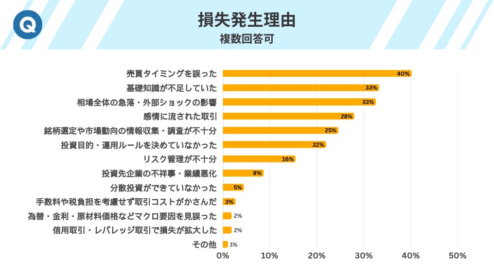 損失が発生した主な理由(複数回答可、損失経験者のみ対象)としては、「売買タイミングを誤った(高値掴み / 早すぎる損切りなど)」が40.2%で最も多く、テクニカルな判断の難しさが浮き彫りになりました。次いで「投資そのものをほとんど勉強しておらず基礎知識が不足していた」(33.3%)、「相場全体の急落・外部ショックの影響」(32.6%)、「感情に流された取引(焦り・欲・恐怖による衝動売買)」(28.0%)が続きました。