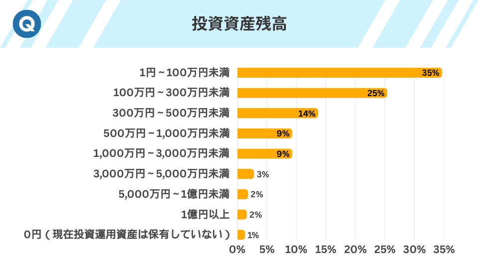 現在の投資運用資産残高は、「1円~100万円未満」(34.7%)が最も多く、次いで「100万円~300万円未満」(25.4%)となっており、比較的少額から投資を始めている層が多いことがわかります。