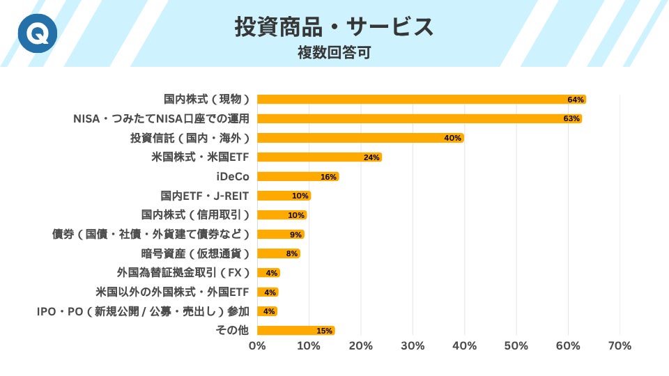 現在投資・投機を行っている商品・サービス(複数回答可)では、「国内株式(現物)」が63.5%で最も多く、次いで「NISA・つみたてNISA口座での運用」が62.7%と高い割合を示しました。新NISA制度の浸透がうかがえます。その他、「投資信託(国内・海外)」(39.9%)、「米国株式・米国ETF」(24.1%)も人気があります。