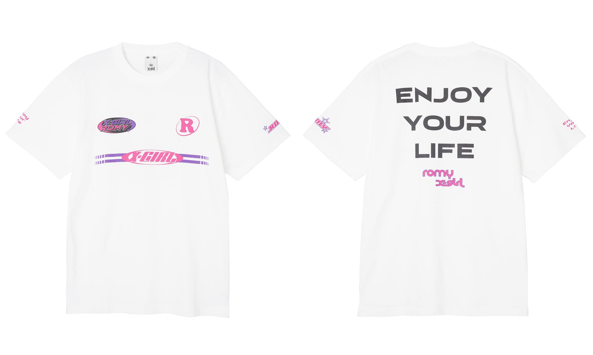 本コラボレーションでは、X-girlとRomyのロゴ、9/8(金)に発売されるRomyのソロデビューアルバム『Mid Air』に収録される曲「Enjoy Your Life」のロゴをレーシングジャケットのようなレイアウトでプリントしたTシャツとスウェットフーディーを展開。S~XLの幅広いサイズ展開もポイントです。