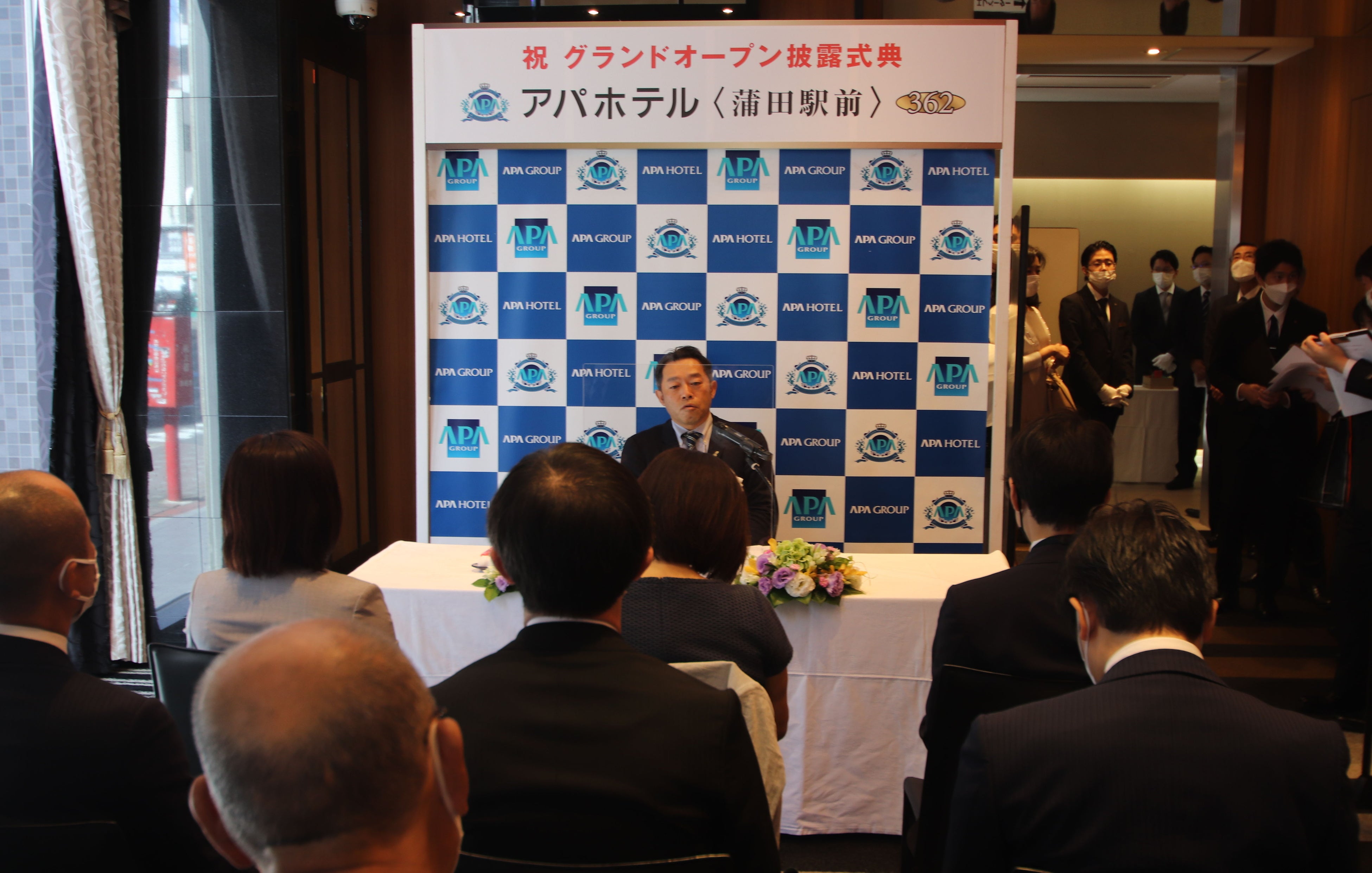 記者発表では、アパグループ社長 兼 最高経営責任者(CEO)元谷 一志が「羽田空港へアクセス至便で交通の要衝として栄えている蒲田エリアに新たに出店できたことを大変嬉しく思う。当ホテルは電鉄系ホテルからのリブランドとなるが、50型テレビの導入や客室の新設などアパの要素を取り入れることでお客様にとってより利便性の高いホテルへとリニューアルを行った。10月11日からは全国旅行支援の開始や水際対策の緩和が予定されており、宿泊増加による地域への経済効果も含め非常に期待している。社会情勢にかかわらず選ばれるホテルとなる為にはブランド力が重要となるので、1ホテル1イノベーションを目標にアパホテルは今後も進化し続けていきたい。」と述べた。