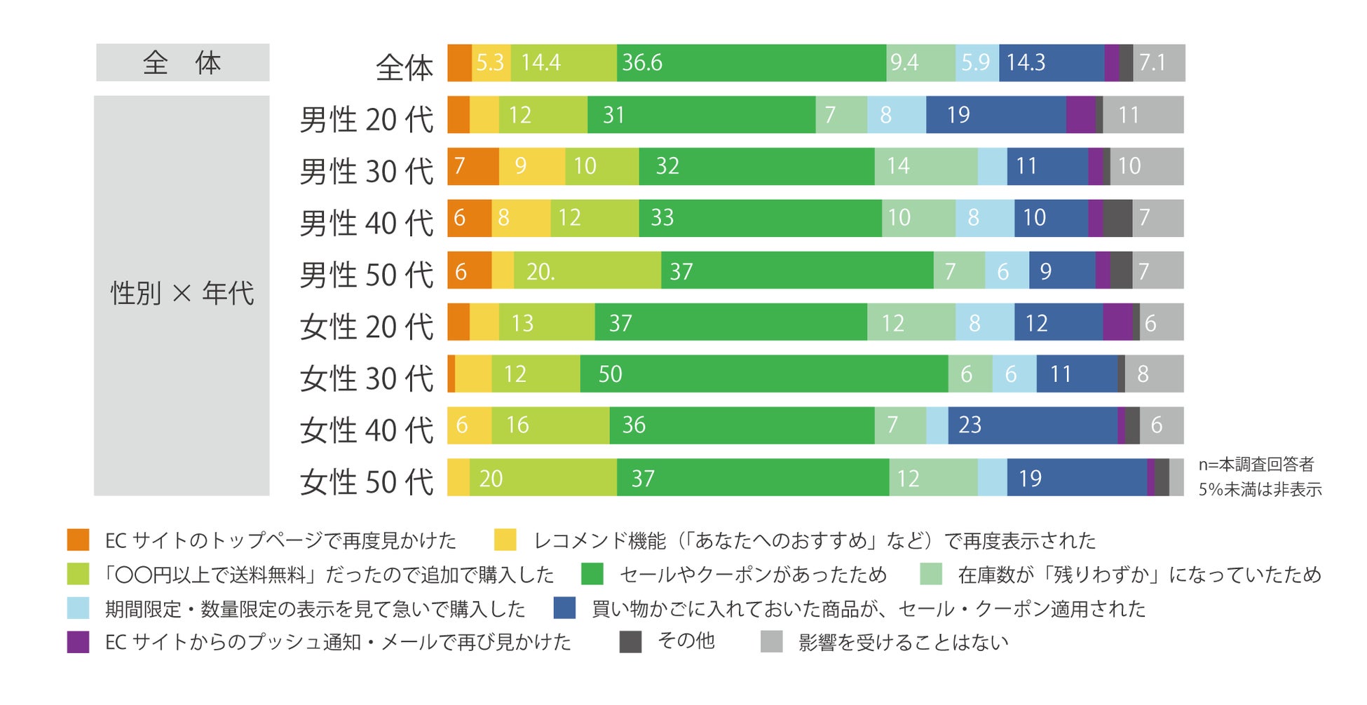 中でも最も影響を受けるものとしては、「セールやクーポンがあったため」(36.6%)が最も高く、次いで「〇〇円以上で送料無料」だったので追加で購入した」(14.4%)、「買い物かごに入れておいた商品が、セール・クーポン適用された」(14.3%)という結果となった。