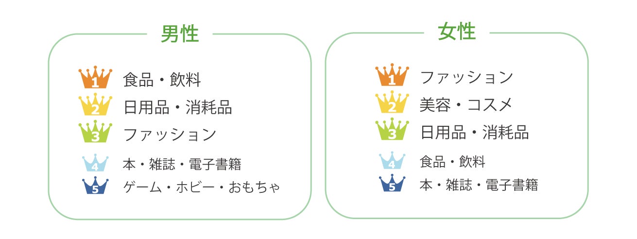 性別で比べた際に、商品カテゴリに差が見られた。男性の1位は「食品・飲料」、女性の1位は「ファッション(服・靴・バッグなど)」という結果が得られた。