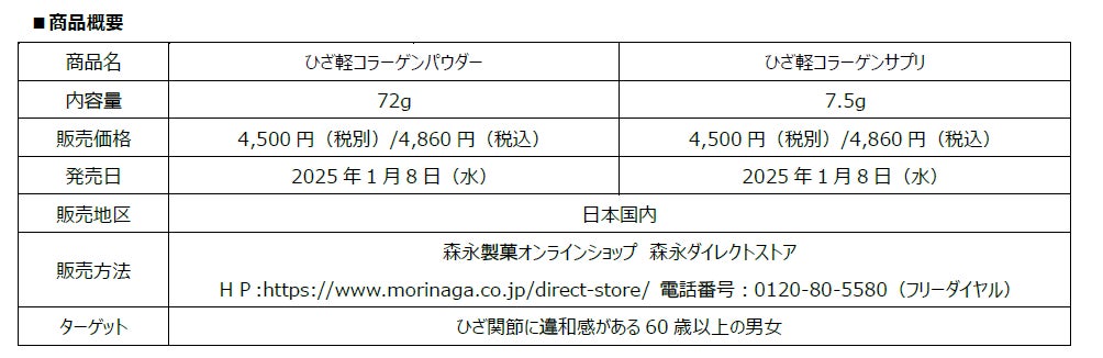 森永製菓はかねてよりコラーゲンによる健康サポートを提案してきました。2022年には、パウダータイプの機能性表示食品「ひざ軽コラーゲン」を発売し、ご好評をいただいております。今回新発売する「ひざ軽コラーゲンサプリ」はタブレットタイプで、1粒で1日分の機能性関与成分(サケ鼻軟骨由来プロテオグリカン16㎎、サケ鼻軟骨由来Ⅱ型コラーゲン16㎎)が手軽に摂取可能です。従来販売しているパウダータイプの「ひざ軽コラーゲン」も、ひざ関節・筋肉・肌に関する機能性関与成分を含んだ機能性表示食品として、「ひざ軽コラーゲンパウダー」に名称変更し、リニューアル発売いたします。