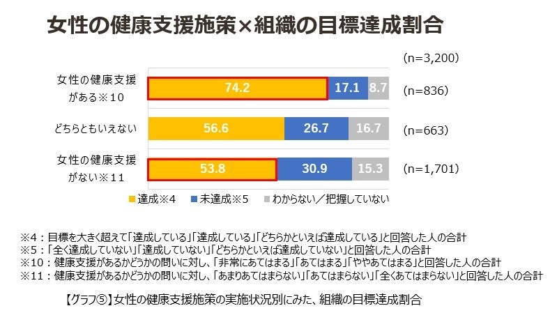 また、女性の健康支援(生理休暇、産業医によるカウンセリング等)があるかを質問したところ、「健康支援がある」と回答した女性グループの「組織の目標を達成している」割合は74.2%、「健康支援がない」と回答したグループの割合は53.8%でした。(【グラフ⑤】)