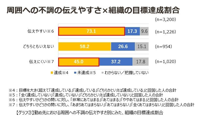 女性特有の不調がある際、勤め先の周囲に対して不調を伝えやすいかを質問した結果、「伝えやすい」と回答したグループの「組織の目標を達成している」割合は73.1%、「伝えにくい」と回答したグループの同割合は45.0%でした。(【グラフ③】)