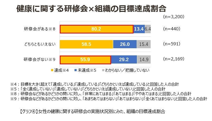 勤め先で、女性の健康に関する研修会などの機会提供があるかを質問した結果、「研修会などがある」と回答したグループの「組織の目標を達成している」割合は80.2%、「研修会などがない」と回答したグループの同割合は55.9%でした。(【グラフ④】)