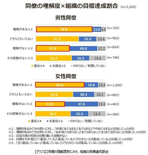 また、勤め先の「同僚」についても、上司の理解度合いと類似した傾向が見られることが分かりました。具体的には、「同僚の理解がない」と回答したグループの目標達成割合が42.0~47.8%に対し、「同僚の理解がある」と回答したグループの割合は69.8~79.9%でした。同僚の理解度別にみた組織の目標達成割合においても、同僚が男性か女性かによる差異は見られませんでした。(【グラフ②】)