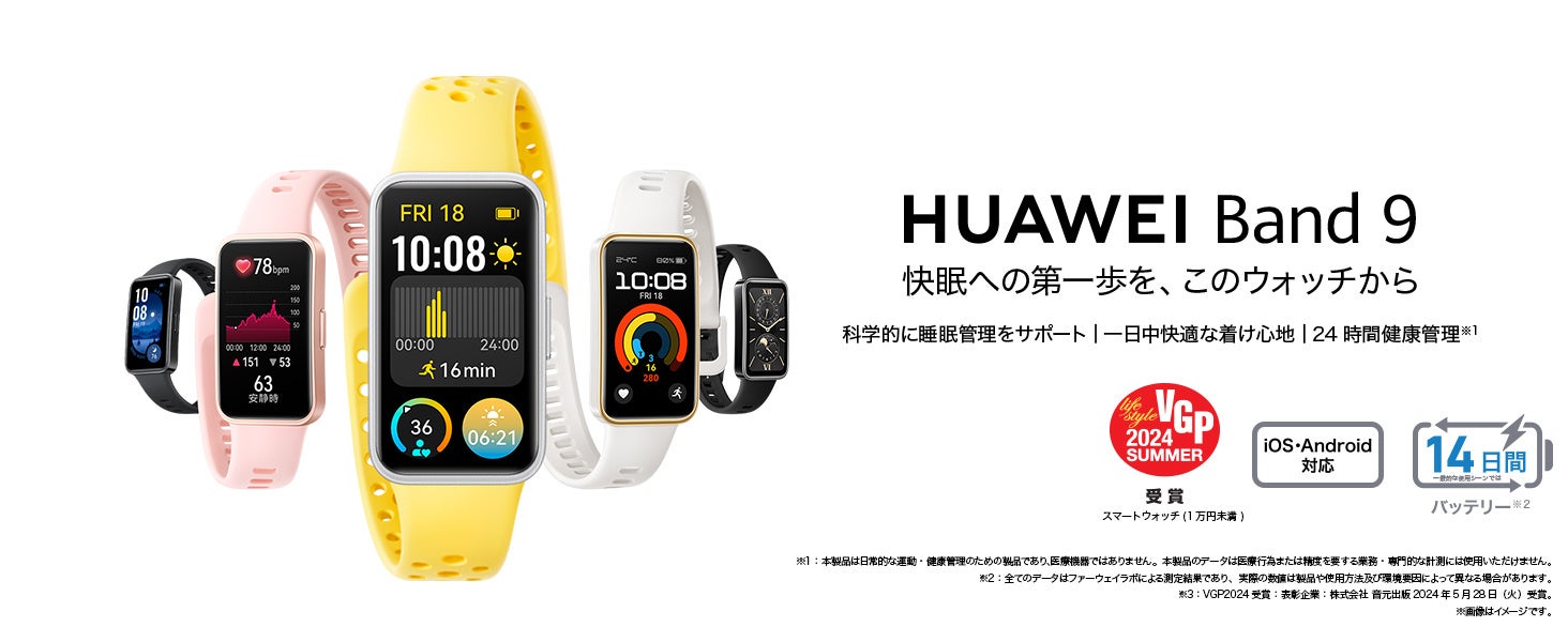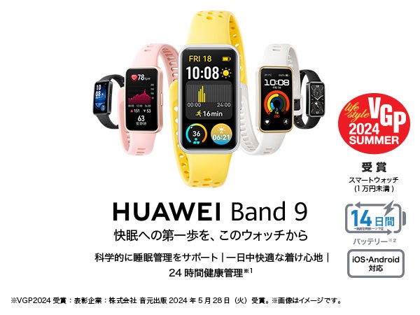 睡眠、血中酸素レベル、心拍数、ストレスレベルの24時間モニタリング※7や、より使いやすくなった生理周期管理などの健康管理機能が満載です。豊富なワークアウトモード、多種多様な文字盤、各種アシスタント機能を搭載し、急速充電に対応し通常使用※8で14日間持続するロングバッテリーにより充電の煩わしさが軽減されます。健康的な毎日を管理できる『HUAWEI Band 9』は買い替えされる方はもちろん、初めてスマートウォッチを使用する方にもおすすめの1台です。