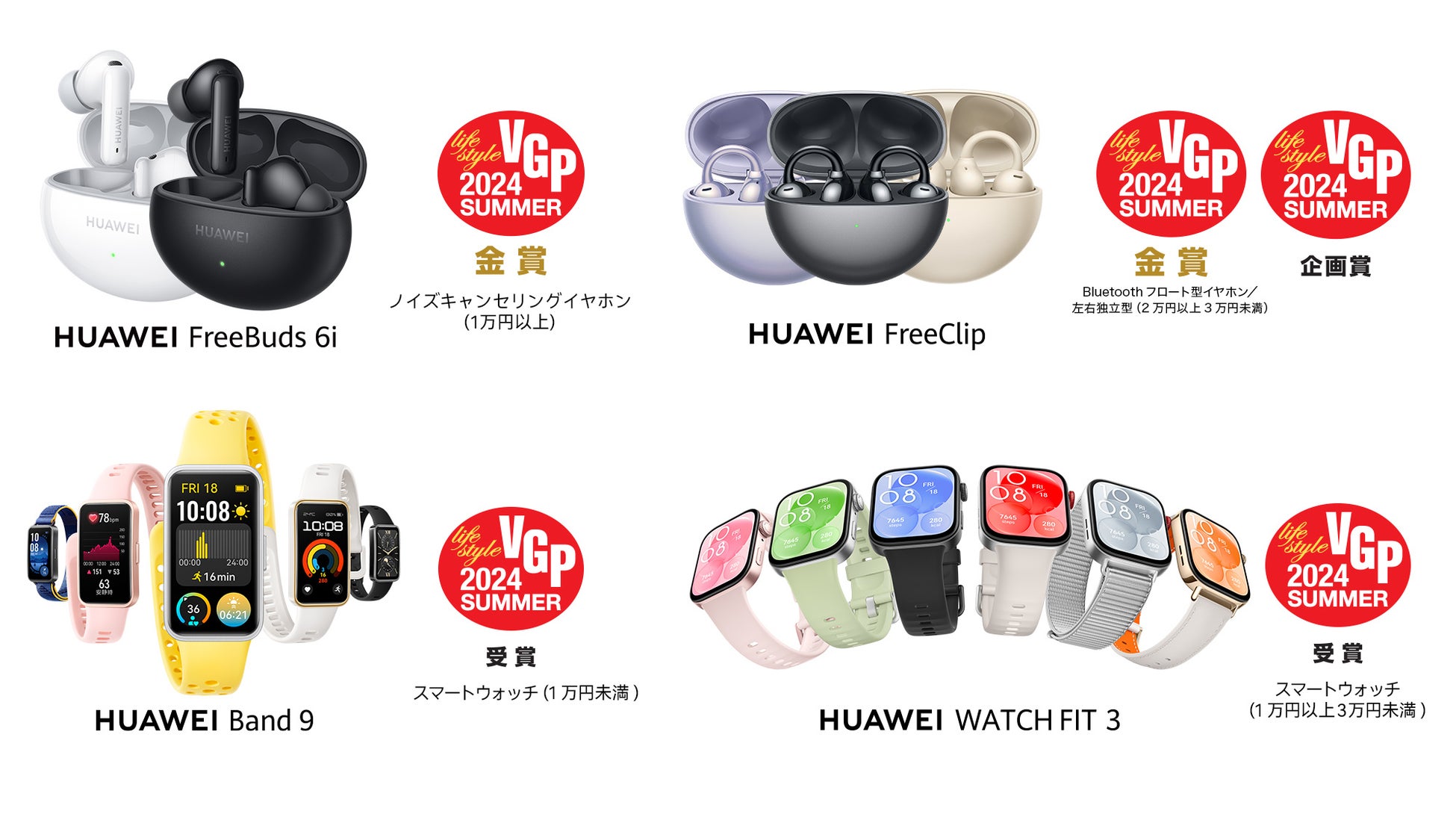 華為技術日本株式会社(ファーウェイ・ジャパン)は、日本国内最大級のオーディオビジュアルアワード「VGP2024 SUMMER」にて、『HUAWEI FreeBuds 6i』が金賞、『HUAWEI FreeClip』が金賞と企画賞、『HUAWEI WATCH FIT 3』と『HUAWEI Band 9』が受賞したことをお知らせします。