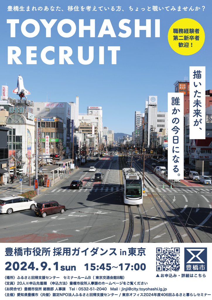 9月1日(日)の東京都での採用ガイダンスでは、市職員が仕事内容の説明や移住定住に関する情報提供などを行う予定です。豊橋会場での採用ガイダンスも9月14日(土)に実施します。