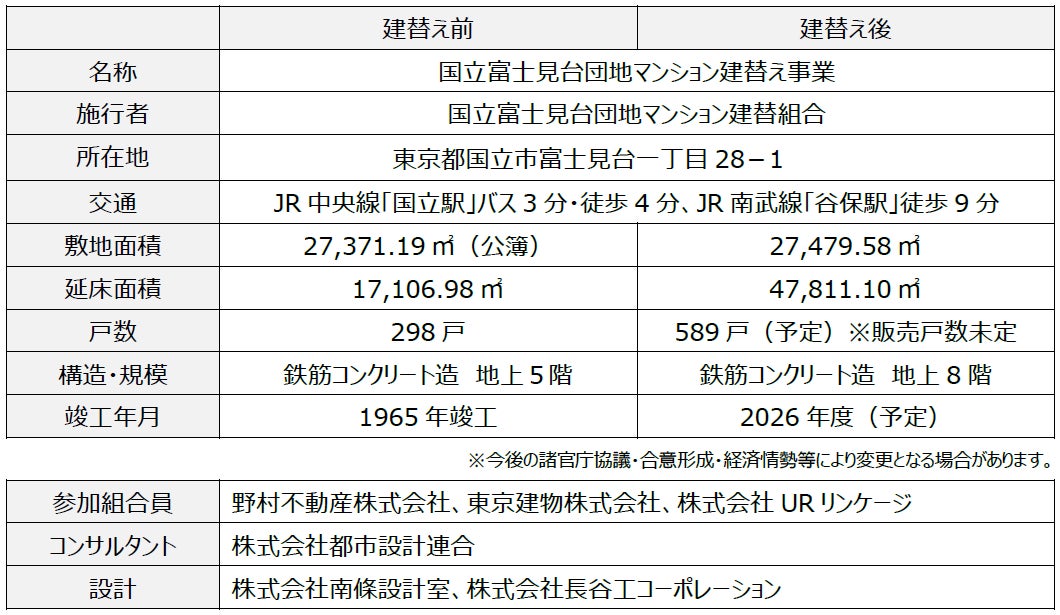 「国立富士見台団地」は、1965年(昭和40年)に竣工した地上5階建、総戸数298戸の建物です。当団地は築後58年が経ち、建物の老朽化やガス、上下水道、電気といったインフラの劣化、バリアフリー基準への不適合など様々な問題を抱え、2014年頃から管理組合内で建替えの検討が開始されました。その後、2018年5月に建替え推進決議を可決、2019年1月には事業協力者の選定を行い、本格的な建替え検討を進めてまいりました。2022年4月の一括建替え決議の成立を経て、同年11月に建替組合が設立され、この度の権利変換計画の認可に至りました。