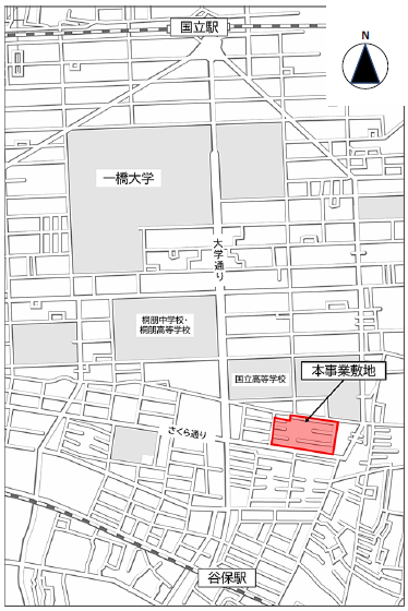 本事業エリアは、国立駅と谷保駅の二つの駅を利用できる利便性がありながら、自然豊かなさくら通り沿いで、緑豊かな住環境が広がっております。