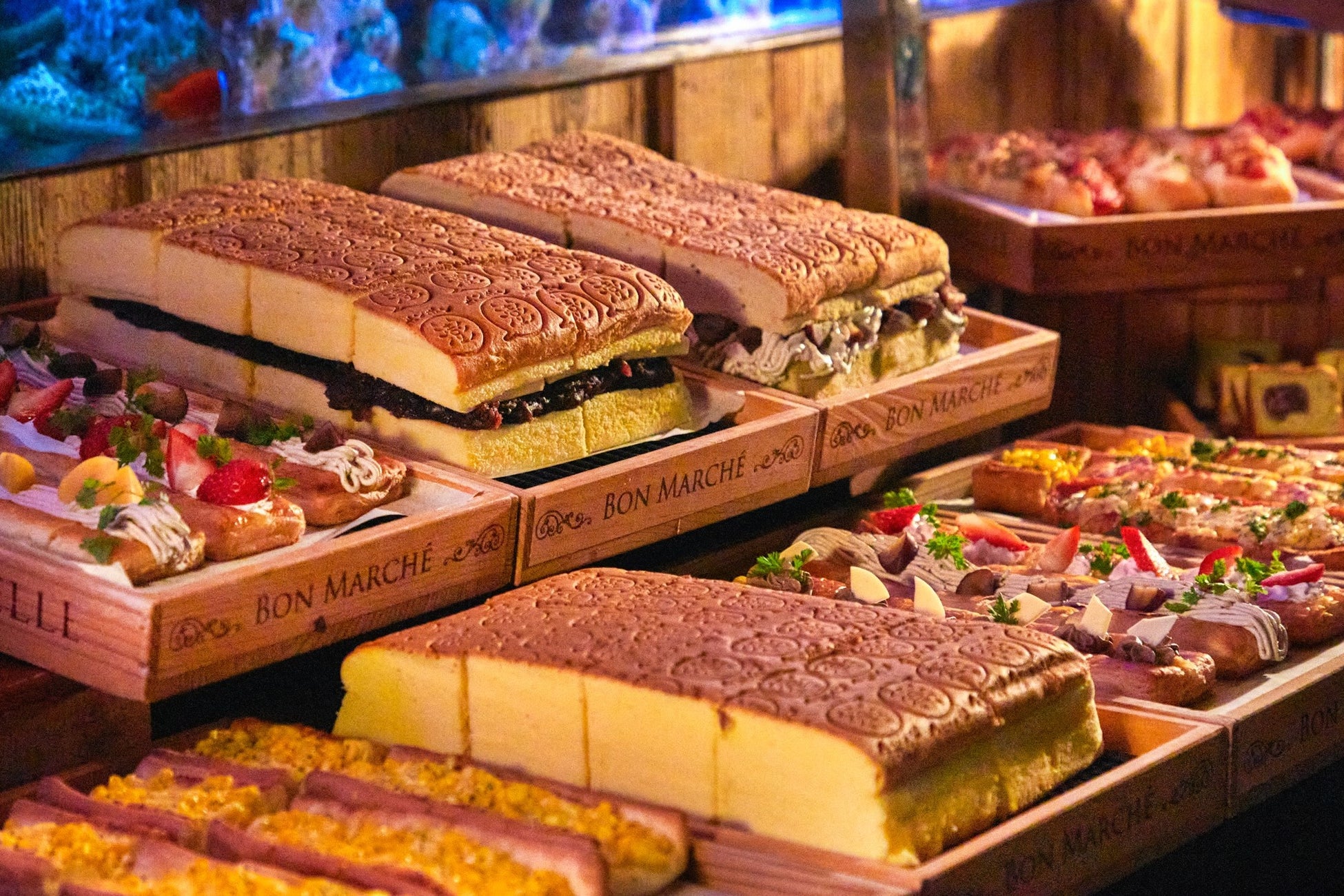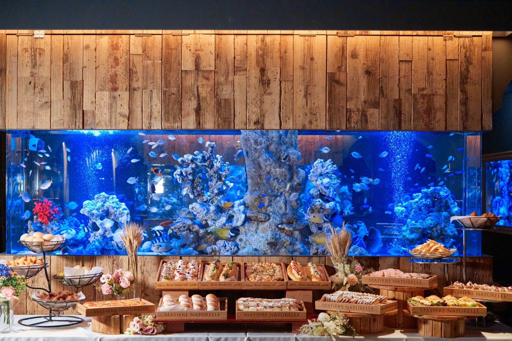 日本最大級となる300坪、300席の店内は、圧倒的な存在感を放つ9面の巨大アクアリウムを設置し1万匹を超す熱帯魚がお出迎えいたします