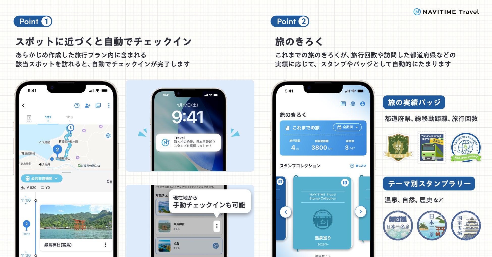株式会社ナビタイムジャパン(代表取締役社長:大西 啓介、本社:東京都港区)は、2026年1月14日(水)より、旅行プランニング&予約サービス『NAVITIME Travel』にて、旅の実績としてバッジやスタンプが自動でたまる「スタンプコレクション」機能を提供開始します。