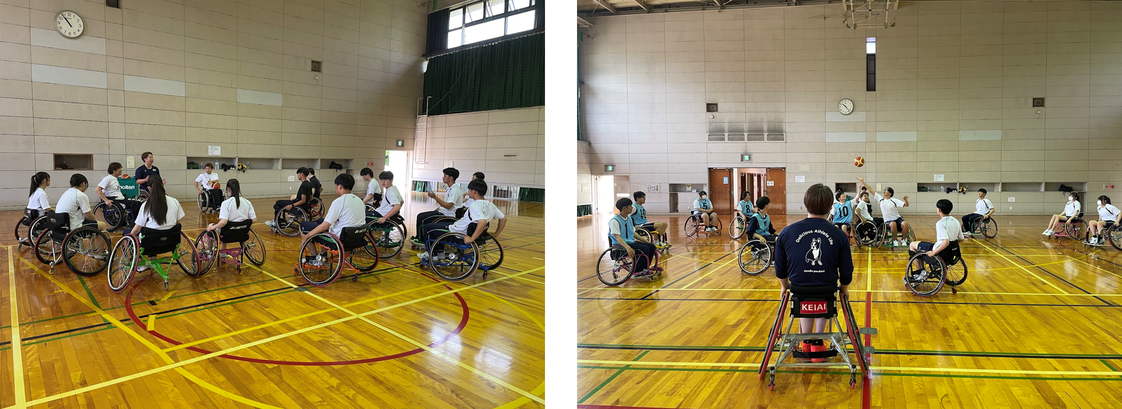 車いすバスケットボールのコートでは、ケイアイチャレンジドアスリートチームに所属する大嶋義昭(おおしま よしあき)選手と森 紀之(もり のりゆき)選手、橘 貴啓(たちばな たかひろ)選手が講師を務めました。参加生徒には、日常で使用する車いすと競技用車いすの違いや、車いすバスケットボールとバスケットボールのルールの違いなどの説明を行い、実際に競技用車いすに乗ってもらいドリブル練習やシュート練習、ゲーム、橘選手VS生徒全員での試合を体験していただきました。