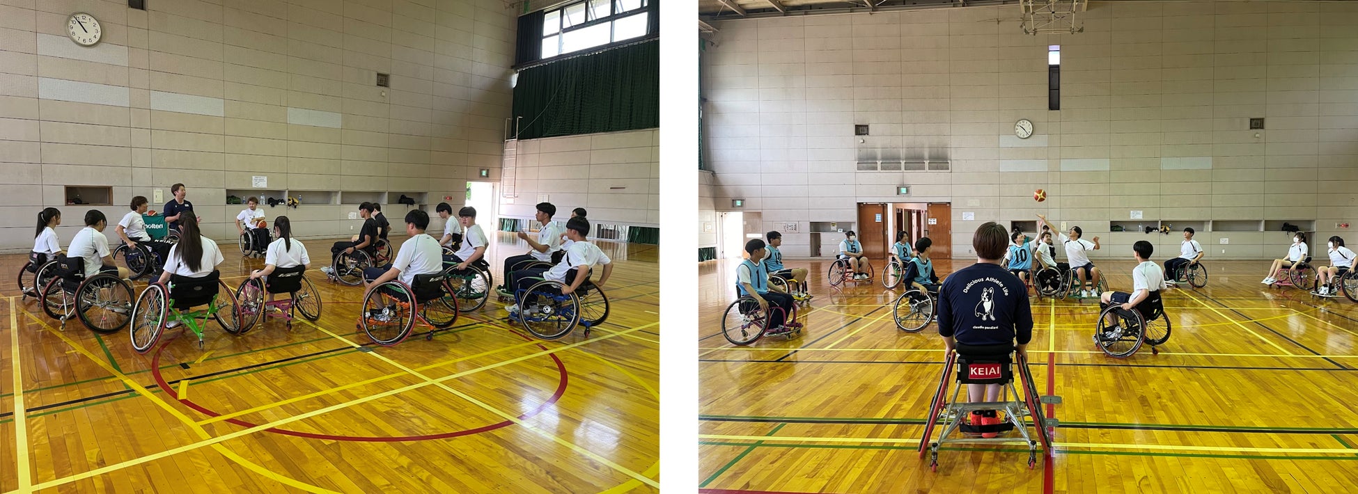 車いすの特徴やルールの説明をした後に、実際に生徒さんに車いすに乗ってもらい基本的な車いすの操作、ドリブル、パス、シュートの練習、ミニゲームをやってもらいました。最初は恐る恐る車いすに乗っていた生徒さんでしたが、ミニゲームの時には楽しそうに走り回っていたのが印象的でした。