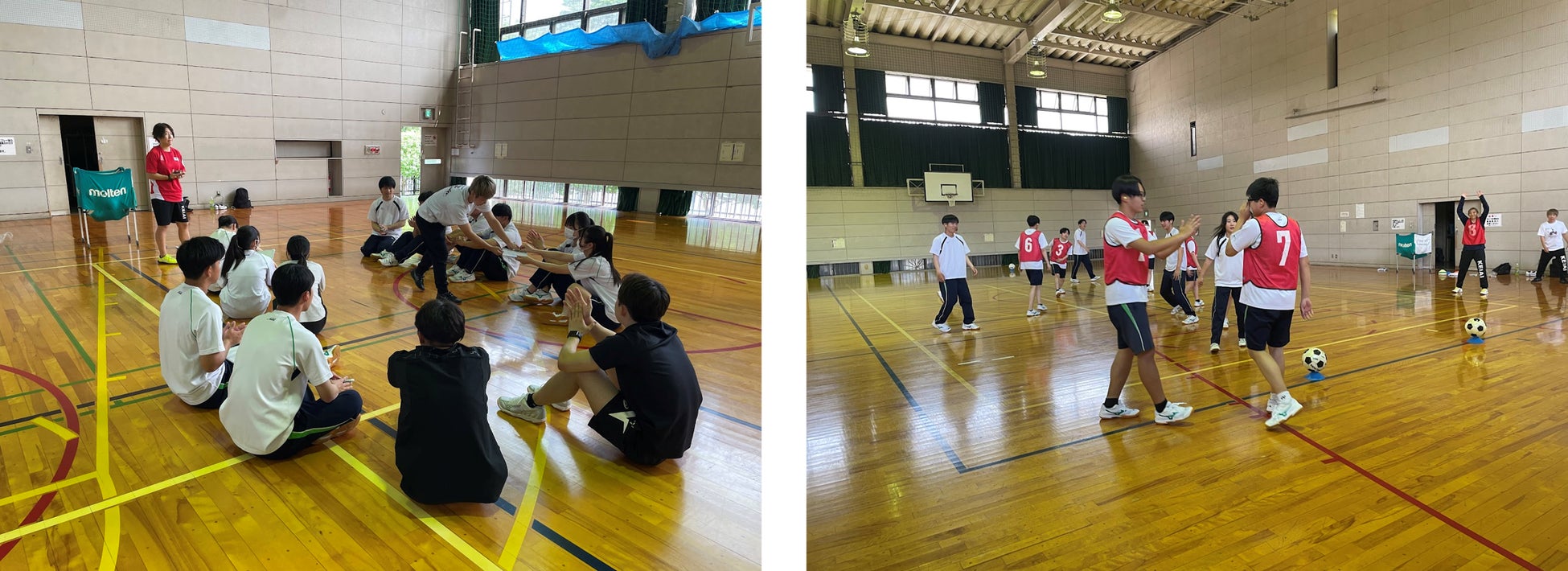 デフフットサルのコートでは、ケイアイチャレンジドアスリートチームに所属する山本 典城(やまもと よしき)監督、川畑 菜奈(かわばた なな)選手と岩渕 亜依(いわぶち あい)選手、酒井 藍莉(さかい あいり)選手が講師を務めました。音のない中でどう工夫してコミュニケーションをとるかや、読唇術とジェスチャーを使った伝言ゲームを行いました。さらにデフフットサルとフットサルの違いを説明し、声出し禁止の中で耳栓をつけてのゲームを体験していただきました。