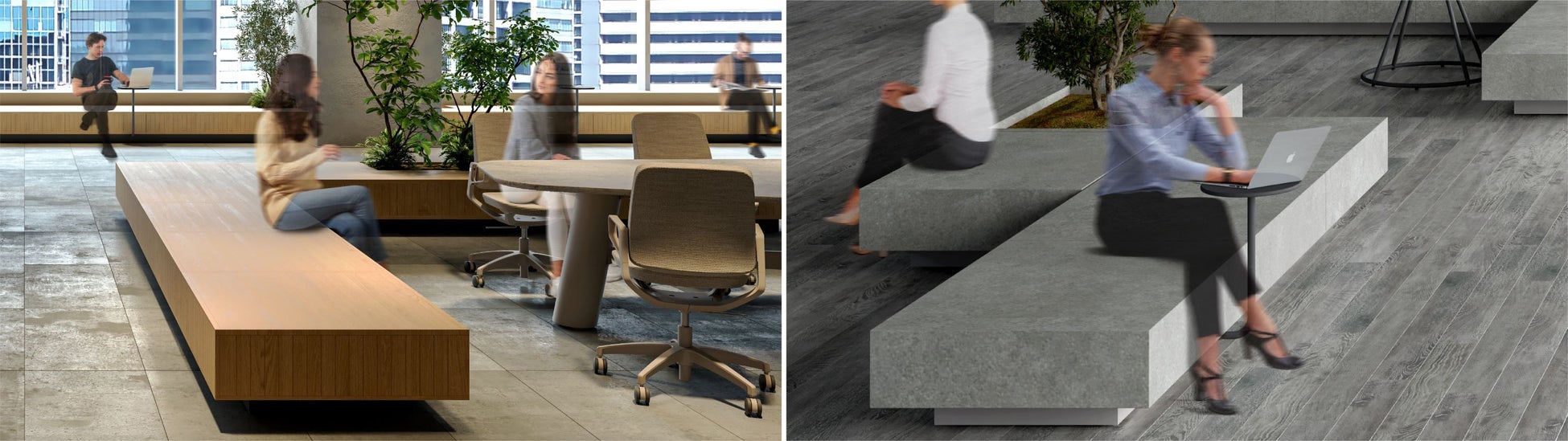 通路や執務エリアの境界に配置することで、程よい距離感を保ちながら空間をゆるやかに仕切ります。同時に、「自然な会話が生まれる場」と「短時間の執務ができる場」を提供します。