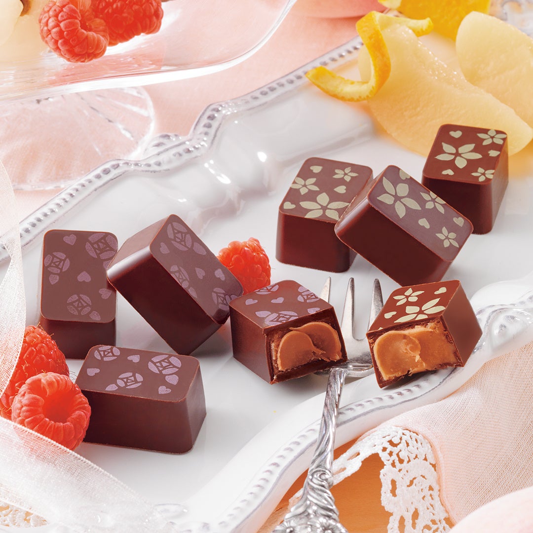 お花の香りとフルーツの風味を組み合わせた、[フランボワーズローズ]と[ピーチジャスミン]の2種類のプラリネショコラ。ほのかなお花の香りとフルーツの風味がチョコレートとひとつになり、まるでフルーツの花束を味わっているよう。