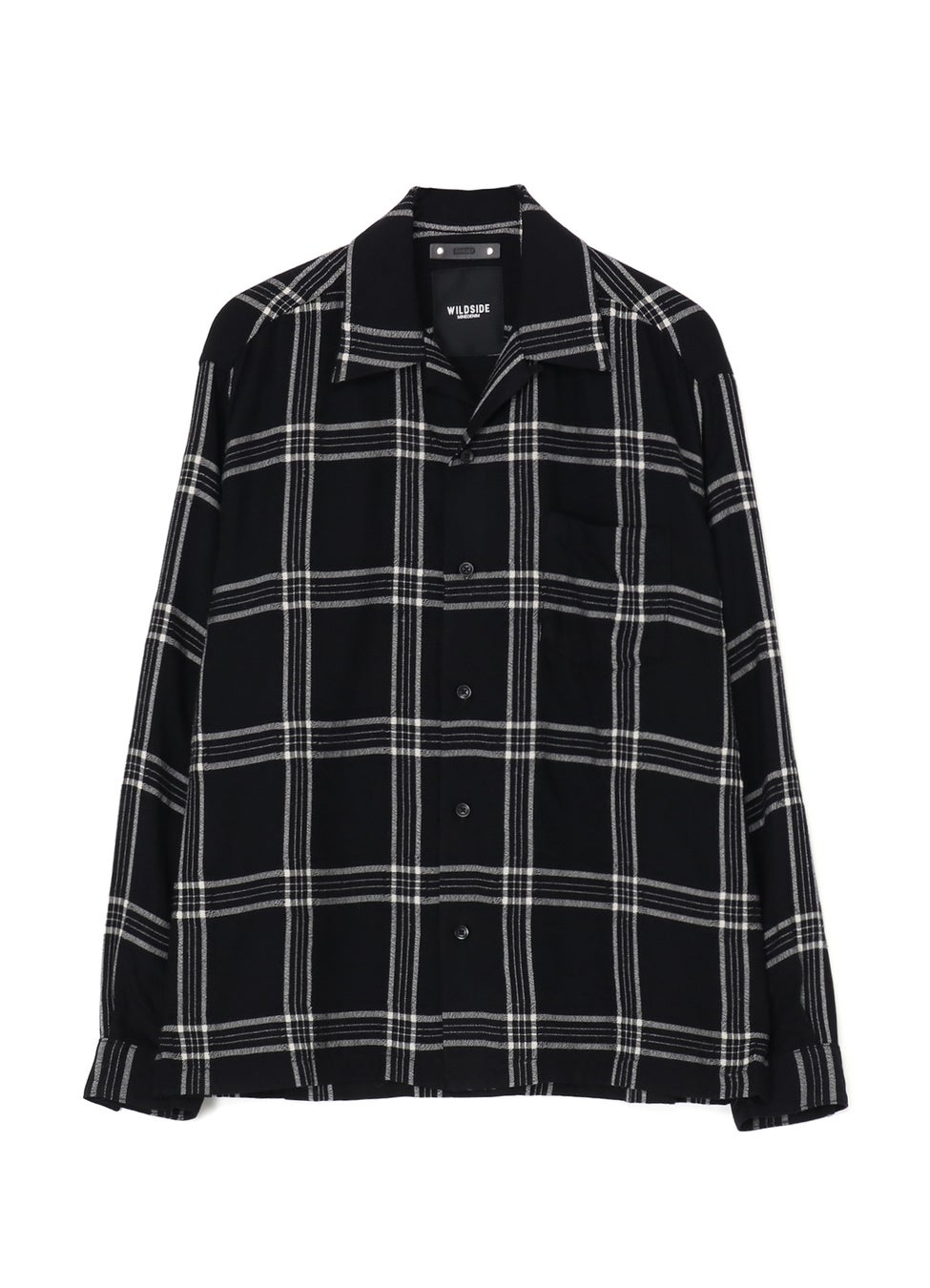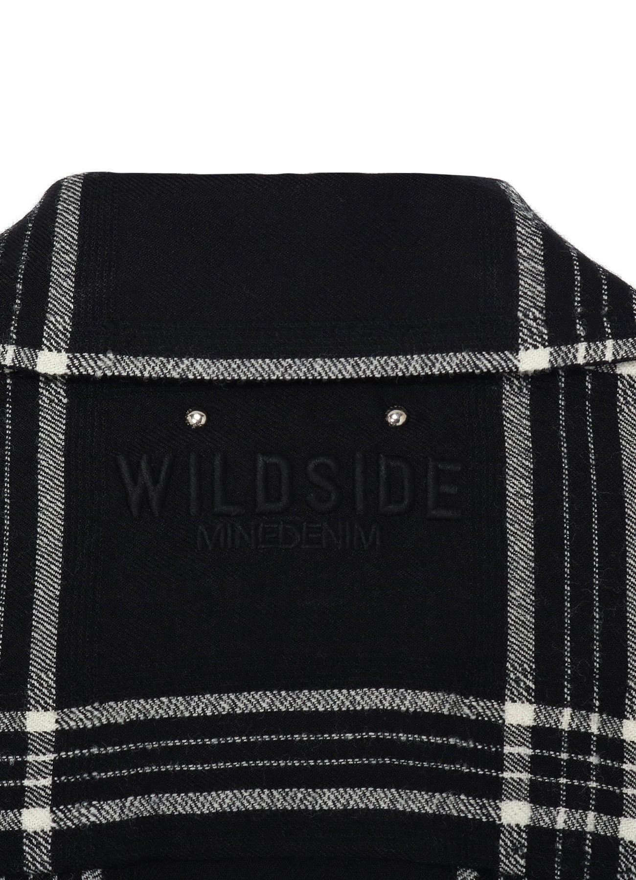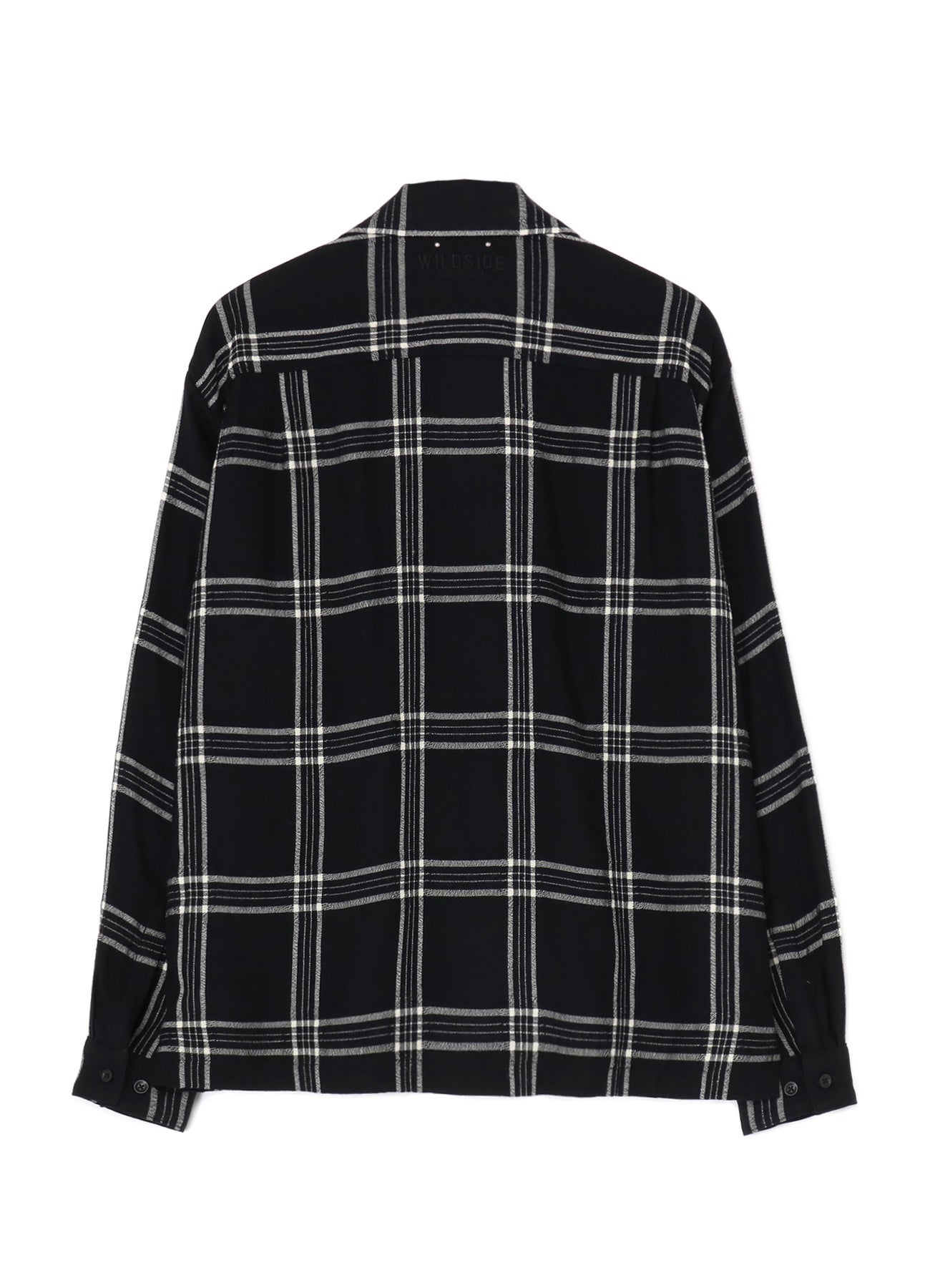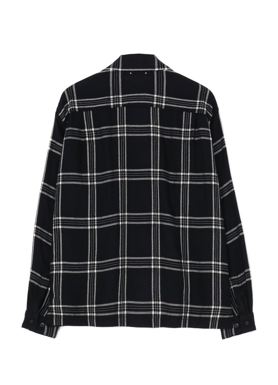 オープンカラーのフランネルシャツは、WILDSIDE仕様として、しなやかな風合いのレーヨンウールのブラックチェック柄のオリジナル生地を使用。バックヨークのネック付近にはWILDSIDEと<MINEDENIM>のネーム刺繍を施したコラボレーションならではのデザインとなっています。
