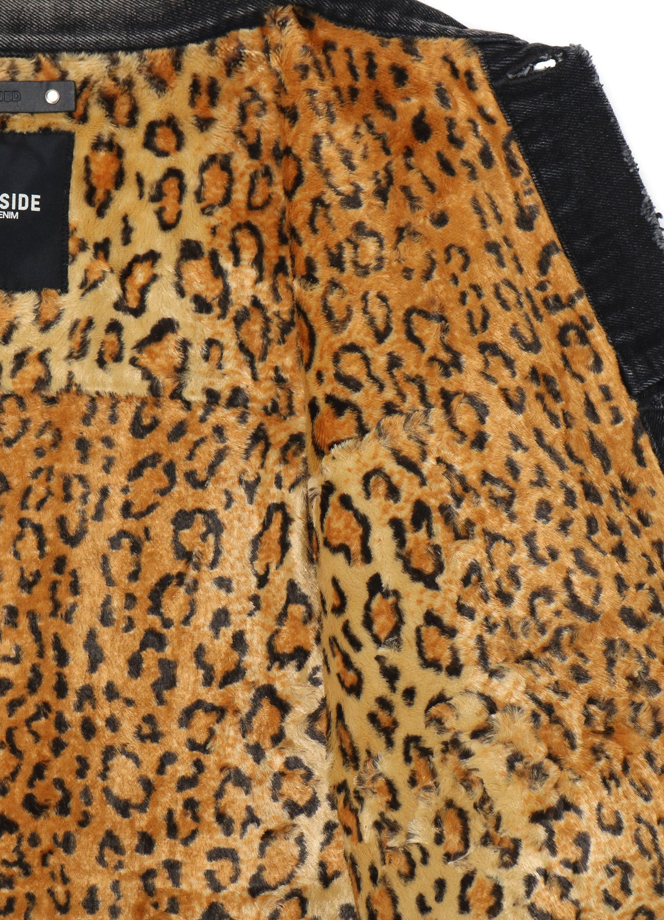 トラッカージャケットは、12ozのナチュラルスラブのブラックデニムを採用。柔らかな風合いとユーズド感のある色落ち加工が、リアルなヴィンテージの雰囲気を表現しています。また、裏地にはレオパード柄のショートファーを使用し、見た目のインパクトに加え防寒性も備えたアイテムです。