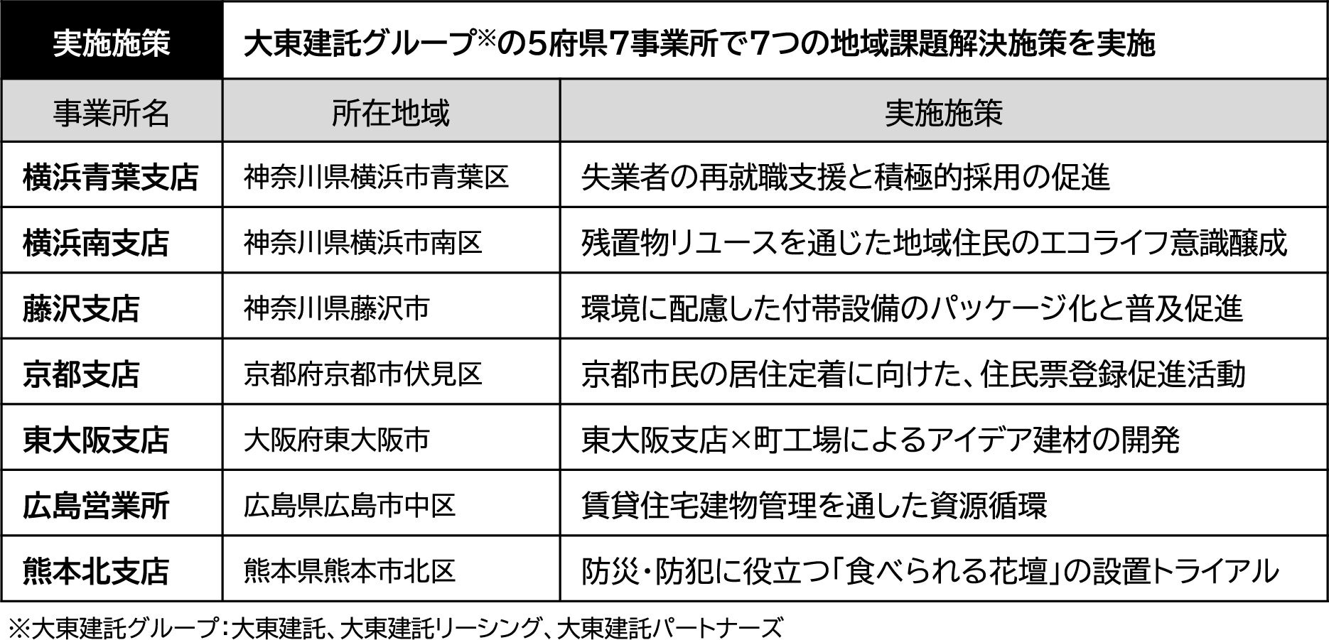 大東建託グループ(本社:東京都港区)は、10月より、本社を除く全国の事業所で働く従業員から、所在地域の課題解決に貢献するアイデアを募集し、実践するプログラム「大東建託グループ SDGsアワード2021」を実施しています。この度応募総数16件のうち、一次審査を通過し施策を実施する7件が決定しましたのでお知らせします。
