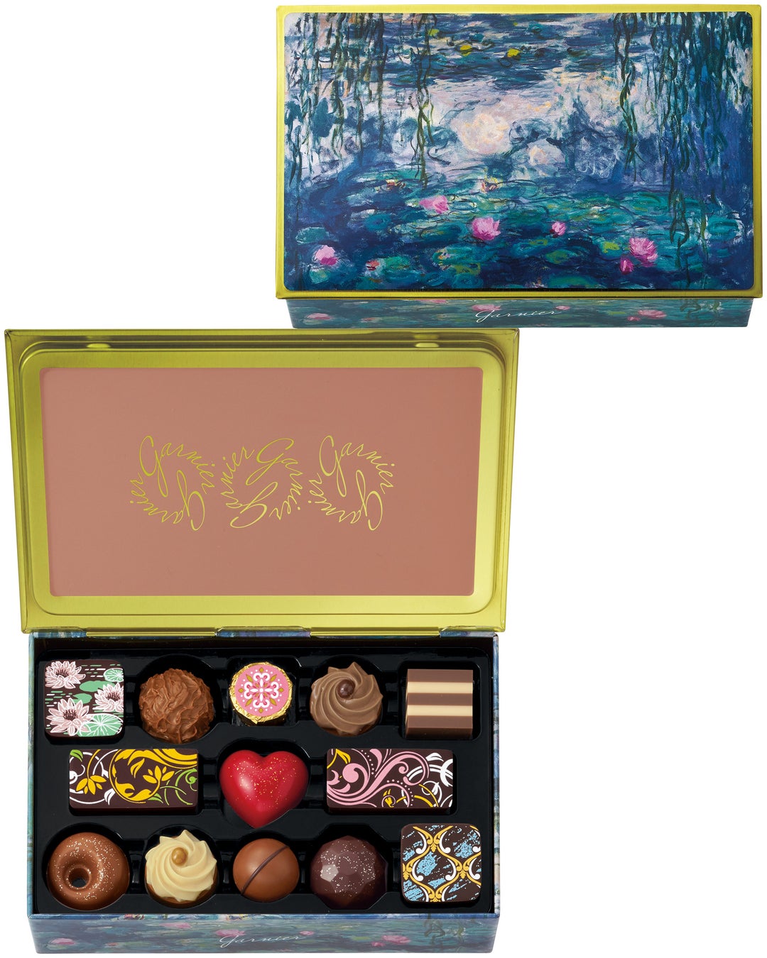 クロード・モネ「睡蓮」の絵画パッケージに、ひとつひとつ丁寧に仕上げたチョコレートを詰め合わせました。