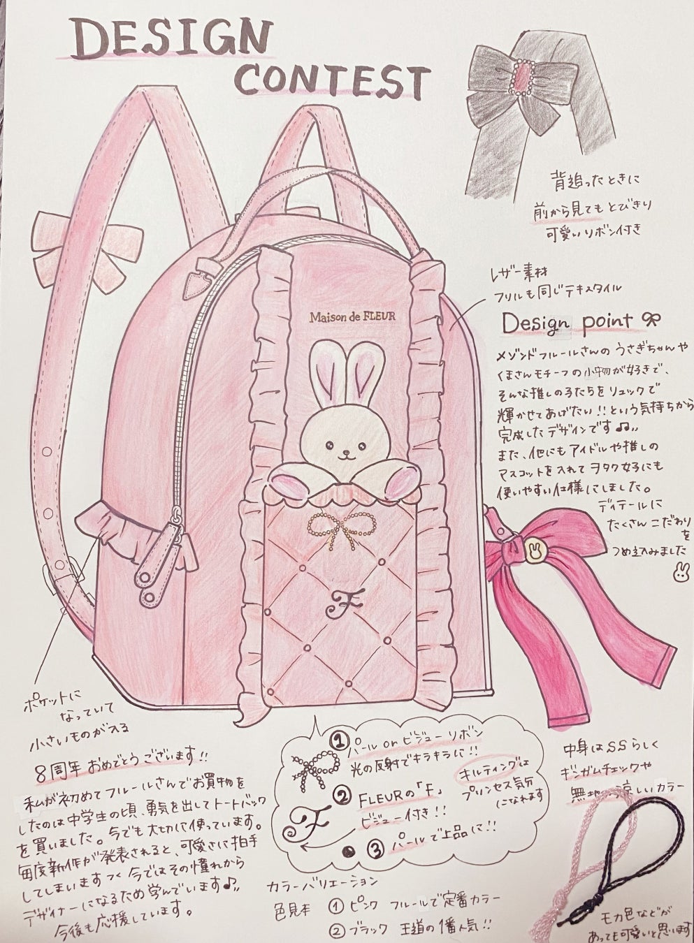 今回、ブランドでも高い人気を誇る「リボンリュック」のデザイン案を募集。『Maison de FLEURをイメージした春夏に使いたいリボンリュック』をテーマに、コンセプトをはじめ、リュック本体やリボンの素材などを自由に発想いただきました。