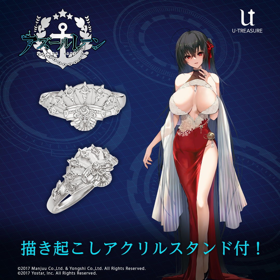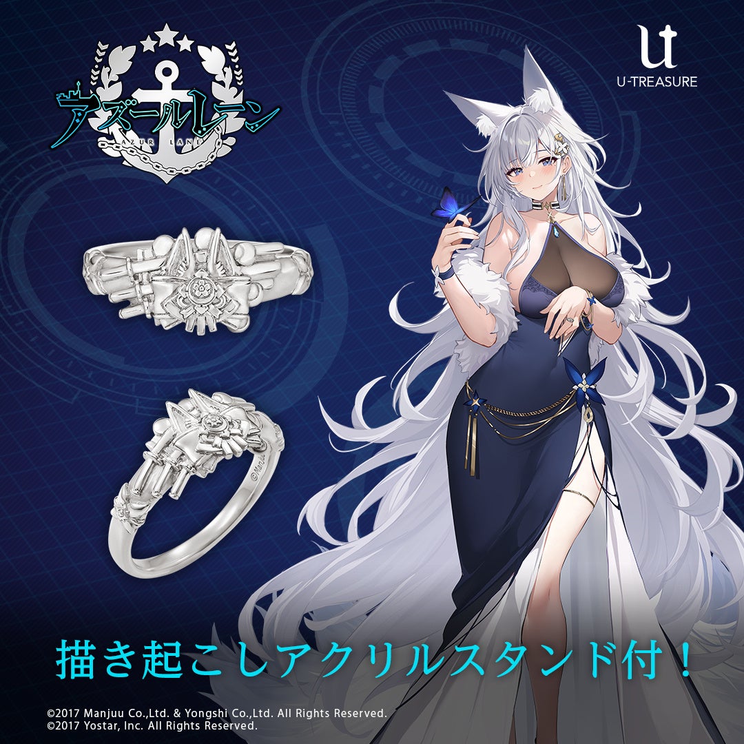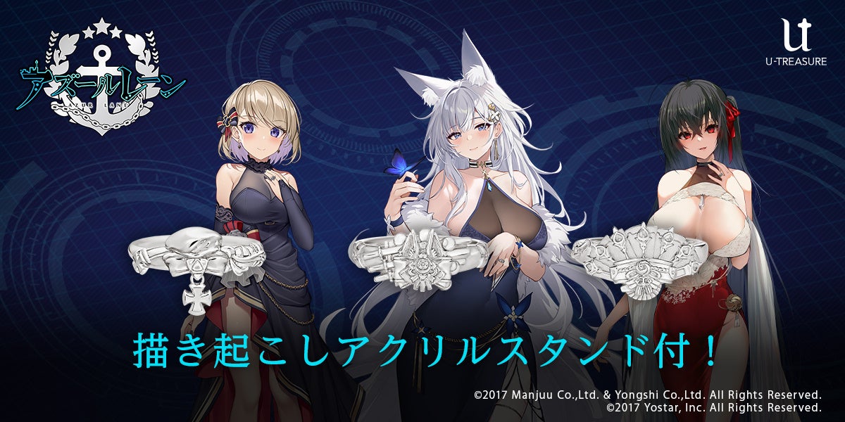 このたびの新作は、鉄血陣営のキャラクターである駆逐艦「Z23(ニーミ)」、重桜陣営のキャラクターである空母「信濃(しなの)」「大鳳(たいほう)」3名それぞれの衣装の装飾やイメージを表現しており、キャラクターをより身近に感じていただけるリング(指輪)です。特典として、ご予約されたリングのキャラクターの描き起こしアクリルスタンドを商品1点ご予約につき、1つプレゼントします。Z23をXe(いくしー)さん、信濃をmomokuさん、大鳳を大慈さんが描き起こしました。ユートレジャーコンセプトストア池袋、ユートレジャーオンラインショップにて取り扱います。