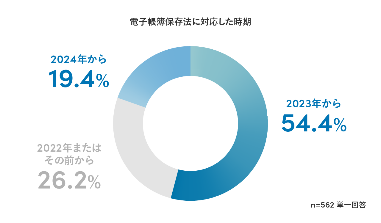 電子帳簿保存法への対応時期を聞いたところ、2023年から対応した人が54.4%と最多で、多くの企業が2023年12月末の宥恕期間終了より前に対応を進めていました。一方で、宥恕期間終了後の2024年から対応を開始した人も19.4%いることが分かりました。
