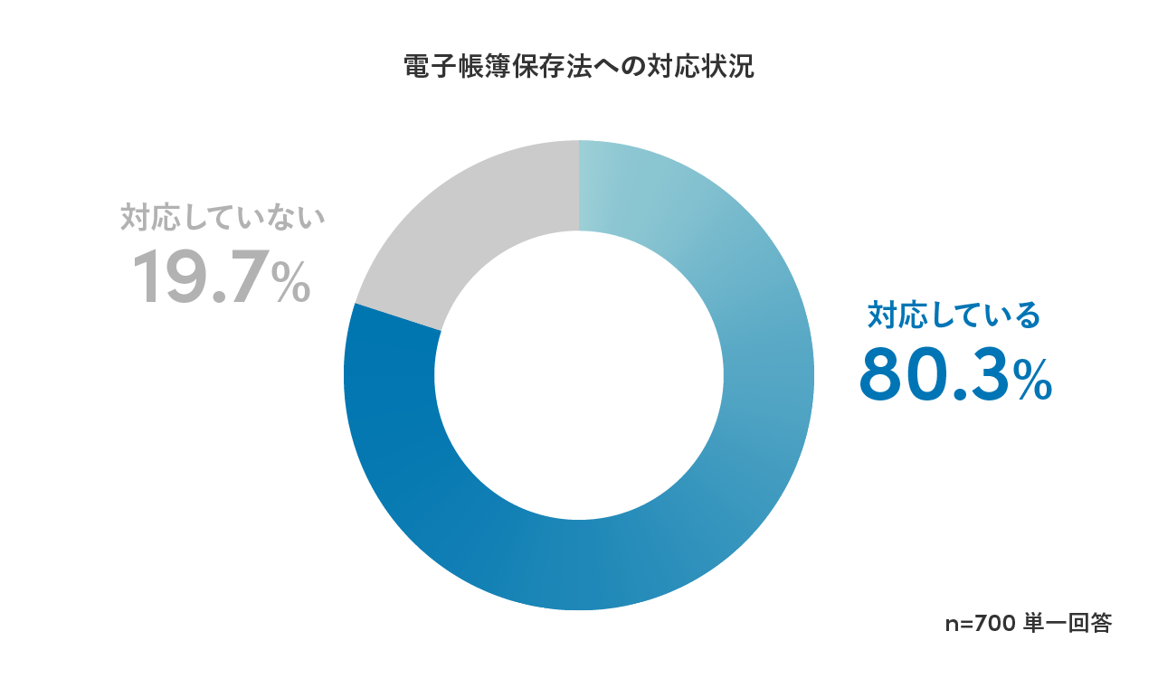 請求書関連業務に携わる経理担当者700名に電子帳簿保存法の対応状況を聞いたところ、対応している人は80.3%、対応していない人は19.7%という結果でした。