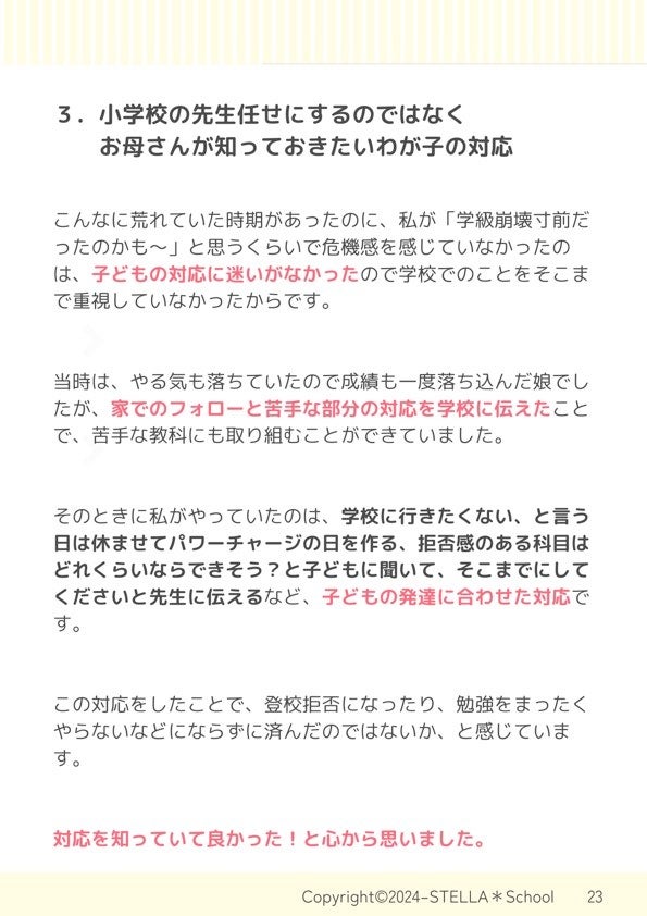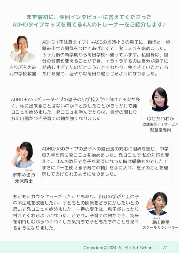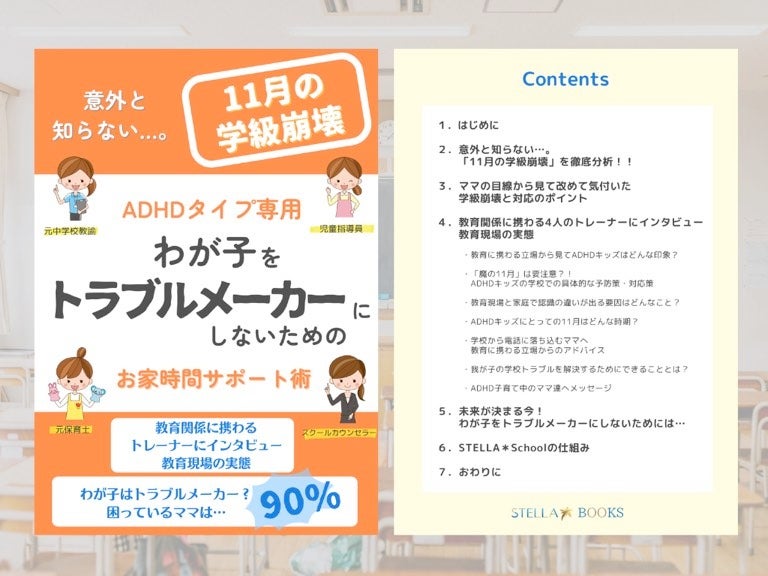 STELLA*Schoolではこのように教育の専門家もADHDの子育てについて研究をしていますので、この電子書籍がADHDタイプのわが子をトラブルメーカーにしたくないと心配するお母さんのお役に立てることを心より願っています。